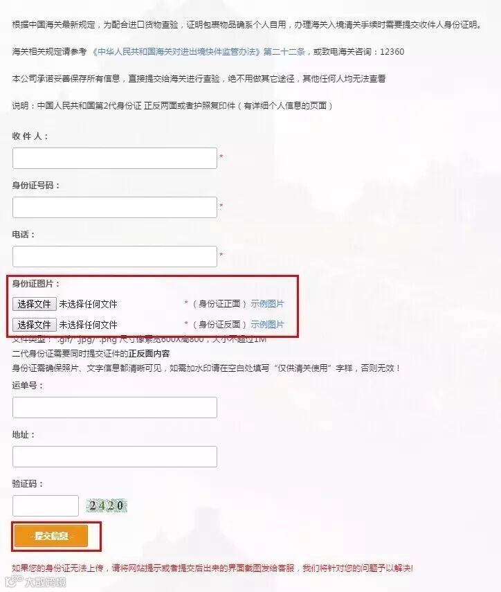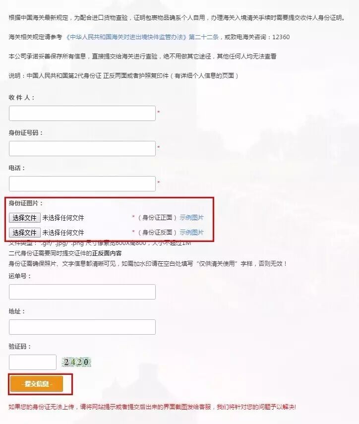 1、请及时规范上传收件人身份证正反面图片,若因客户原因未能及时上传身份证所造成的延误,其后果由自己承担。