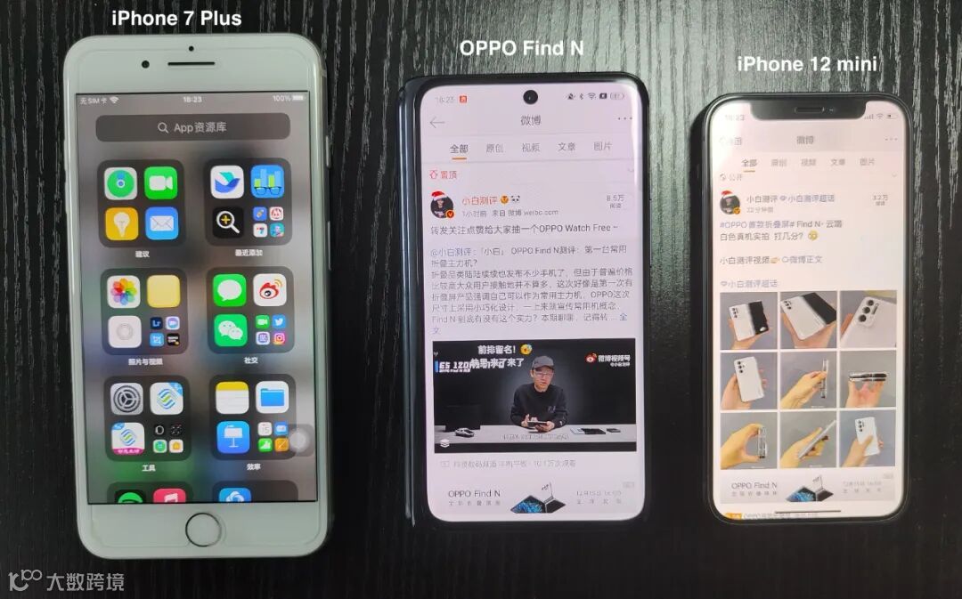 细节上,OPPO Find N图片看起来比较胖乎乎,但实际折叠起来机身手感还好,和老iPhone 7 Plus屏幕的显示面积差不多大小。