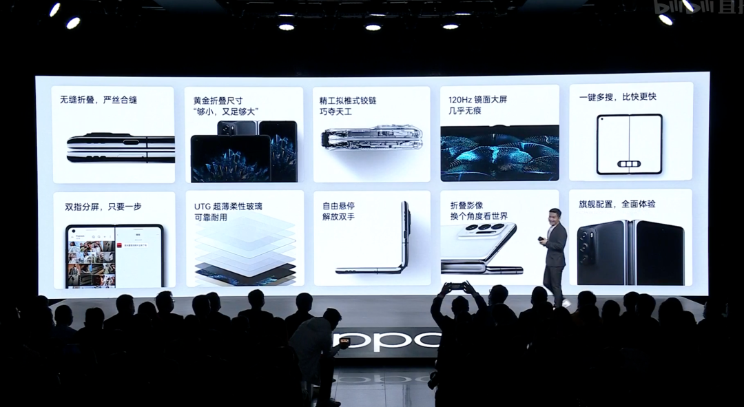 作为OPPO首款量产折叠屏,官方主打10个技术点:无缝折叠 严丝合缝、“够小 又足够大”的“黄金折叠尺寸”、全球首款精工拟椎式铰链 水滴形无缝折叠;120Hz几乎无痕镜面大屏、UTG超薄柔性玻璃、平行视界 自由拖拽双屏多任务、多角度自由悬停、一键多搜等系统体验等等。(系统体验篇幅略多,感兴趣可到官方查看,公众号仅简单整理)
