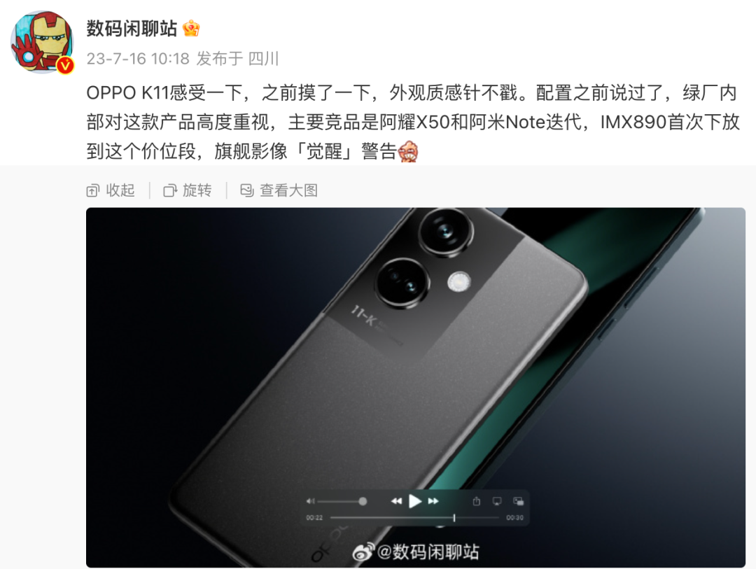据数码闲聊站表示:OPPO K11外观质感不错,绿厂内部对这款产品高度重视,主要竞品是荣耀X50和Redmi Note 13,OPPO首次将索尼IMX890 5000万像素大底主摄下放到千元机这个价位段,旗舰影像「觉醒」警告。