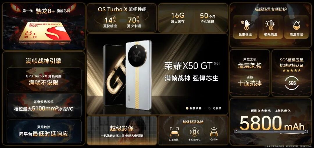 荣耀X50 GT主要配置:6.78英寸2652*1200分辨率的1.5K居中单挖孔曲屏,120Hz刷新率,1920Hz PWM调光,短焦屏下指纹,机身三围163.6*75.5*厚约7.98mm,重约192g,前置8MP,后置双摄108MP主摄+2MP景深,搭载骁龙8+ 3.0Ghz版处理器,5100mm²苍穹散热系统,5800mAh电池、35W快充,支持NFC,单扬声器,预装MagicoS 7.2等。
