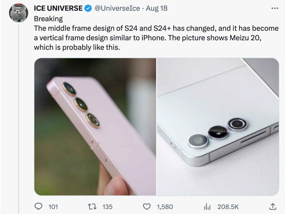 据i冰宇宙爆料,三星S24和S24+中框设计将会变为类似iPhone的直角中框,并晒出了两张友商产品真机图,称S24/S24+中框效果大概就和魅族20系列一样。(这波算不算珠海小三星提前呈现?国际三星靠近中