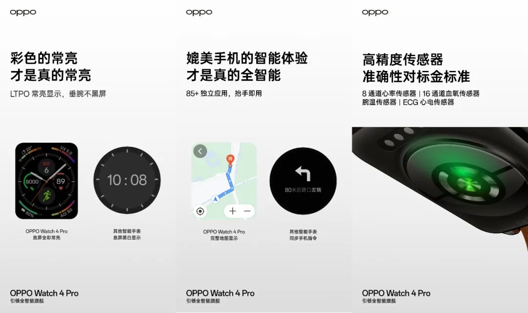 此外,OPPO Watch 4 Pro依然采用矩形表盘,支持LTPO常亮显示、息屏全彩常亮,支持85+独立应用、完整地图显示,内置8通道心率传感器、16通道血氧传感器、腕温传感器、ECG心电传感器。
