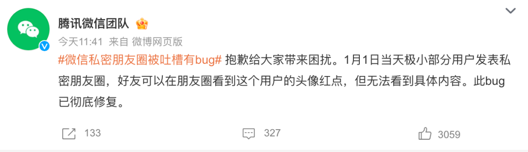 今天腾讯微信团队发文回应,表示:“抱歉给大家带来困扰。1月1日当天极小部分用户发表私密朋友圈,好友可以在朋友圈看到这个用户的头像红点,但无法看到具体内容。此bug已彻底修复。”