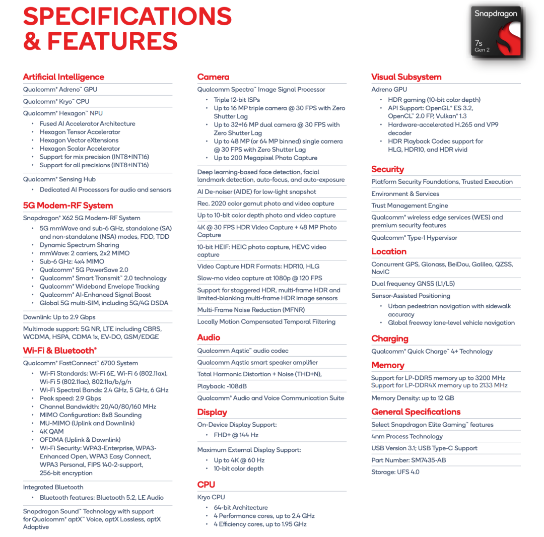 作为补充,「骁龙7s Gen2」是2023年9月份发布的,由Redmi Note 13 Pro首发搭载,主要规格为:三星4nm制程,八核CPU为4*2.4GHz大核+4*1.95GHz小核,Adreno GPU,集成骁龙X62 5G调制解调器,WiFi 6E、蓝牙5.2,最高支持200MP单摄,4K30fps视频录制,FHD+ 144Hz显示屏,LPDDR5等。