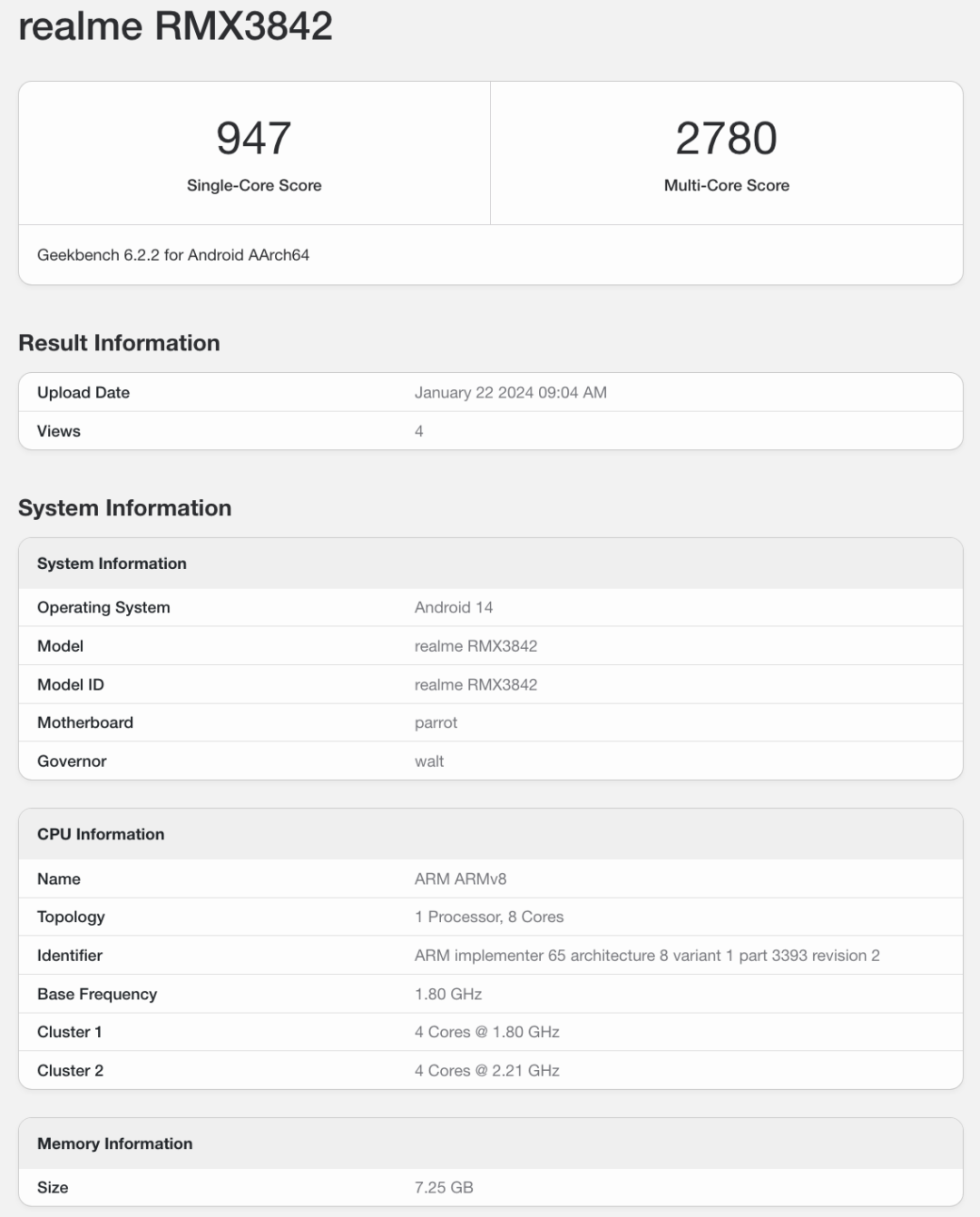 首先是真我12 Pro,Geekbench 6单核跑分947,多核跑分2780,搭载的处理器CPU规格为:4*2.21GHz+4*1.8GHz,对应的是荣耀X50同款骁龙6 Gen1。