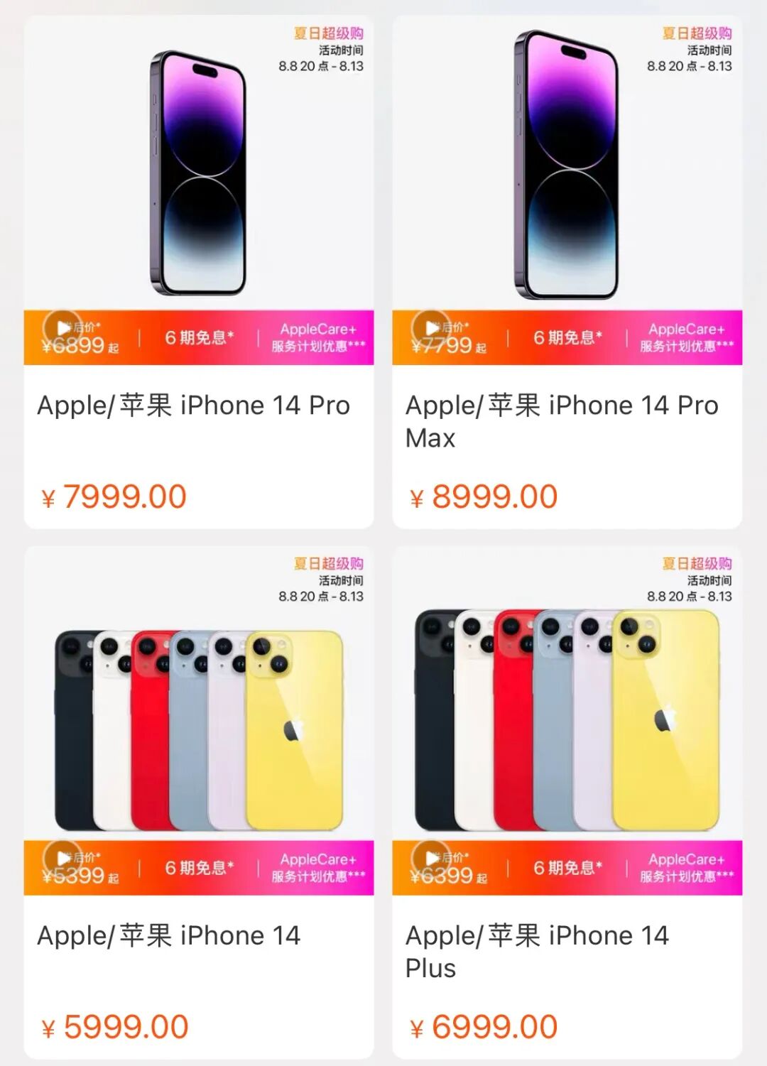 不过看了下价格,就iPhone 14系列为例,本次活动iPhone 14预计5399元起(官网原价5999元),iPhone 14 Plus活动价6399元起(官网原价6999元),iPhone 14 Pro活动价6899元起(官网原价7999元),iPhone 14 Pro Max活动价7799元起(官网原价8999元),价格不如第三方,但胜在支持花呗6期免息分期,以及有天猫淘宝的惊喜优惠券,预计88VIP的100元优惠券也可以使用。在iPhone 15系列即将发布的前一个月,坦白说不太建议以官方价入手,如果价格再低一些则还行,不着急的也可以等等15系列,预计15系列发布后14系列也会进行再度调价~