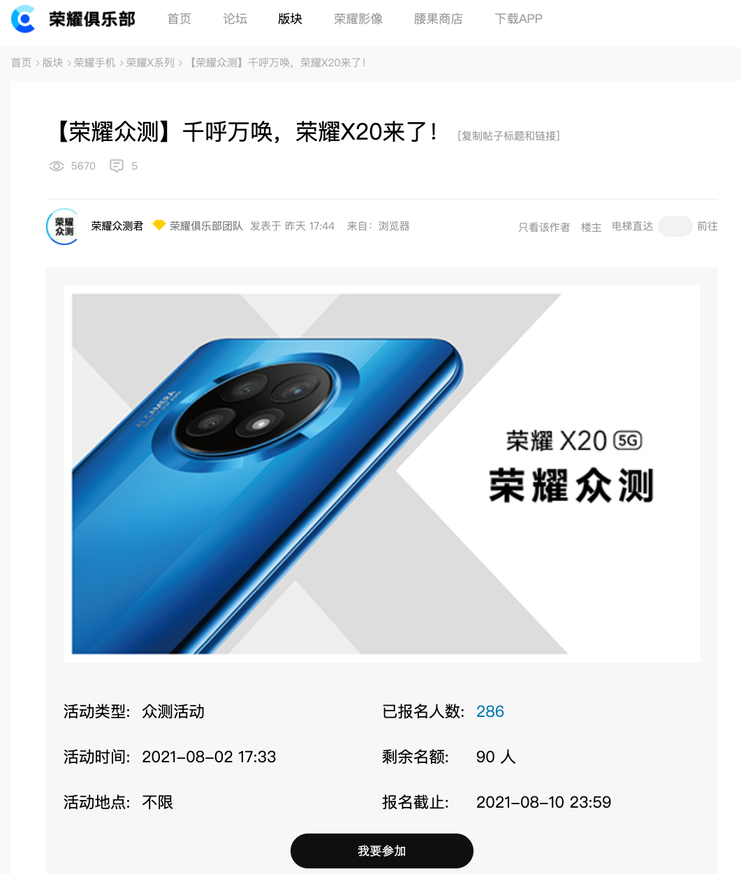 关于荣耀X20官方似乎没有进行过多预热,但是荣耀俱乐部的众测活动提前公布了真机,可以看到荣耀X20背部采用居中奥利奥圆形后置三摄,右下角那颗应该是闪光灯。