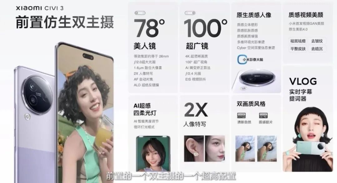 影像部分,Civi 3前置双摄32MP 78°+32MP 100°超广角,多色温四柔光灯,主打原生质感人像,前置支持4K30fps视频录制;后置50MP主摄(IMX800)有OIS+8MP超广角(IMX355)+2MP微距,小米影像大脑;