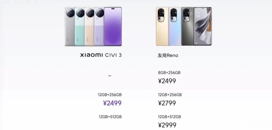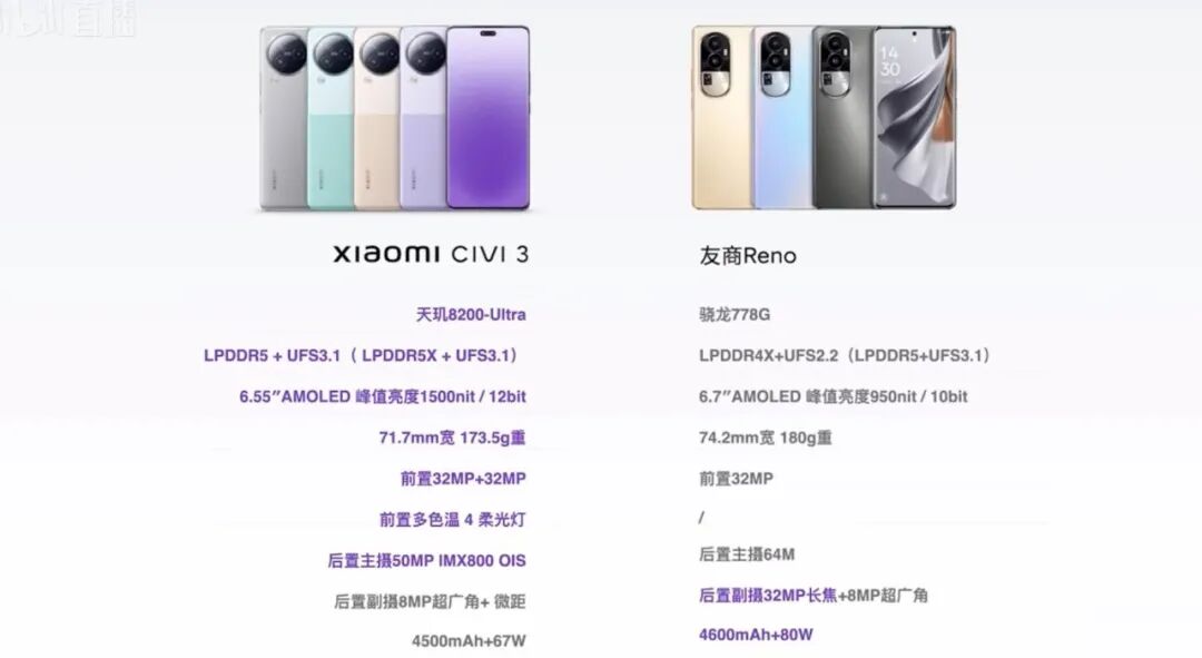 发布会上,小米Civi 3还对比了一波OPPO Reno10标准版。