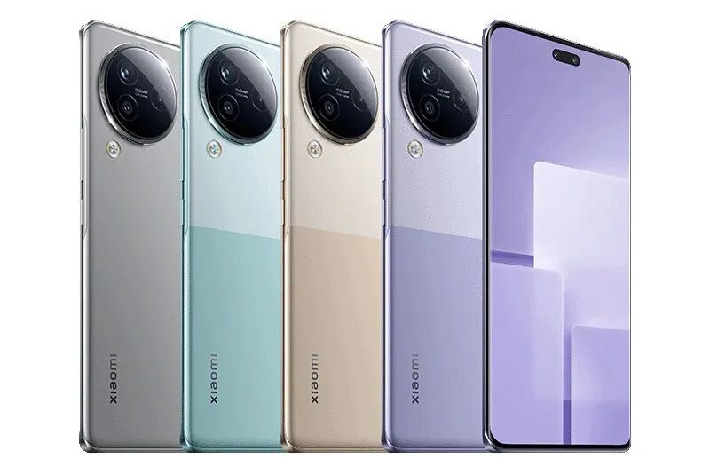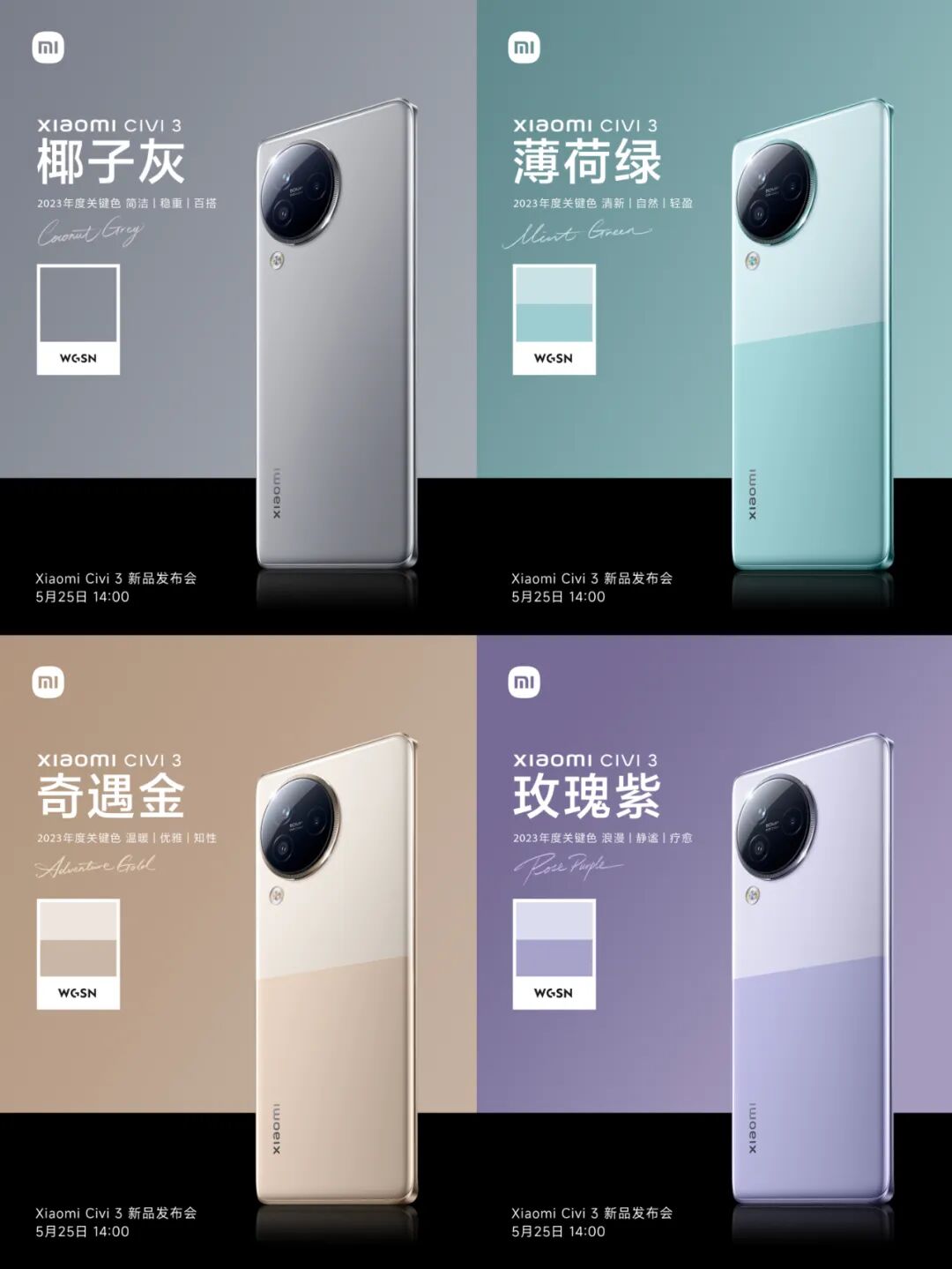 小米Civi 3主要配置:6.55英寸2400*1080分辨率的居中双挖孔华星光电C6 AMOLED微曲面屏,120Hz屏幕刷新率,240Hz触控采样率, 1920Hz PWM高频调光,峰值亮度1500nit,屏下指纹;提供玫瑰紫、薄荷绿、奇遇金、椰子灰4个配色,塑料中框,机身三围158.75*71.7*厚约7.56mm,重约173.5g;