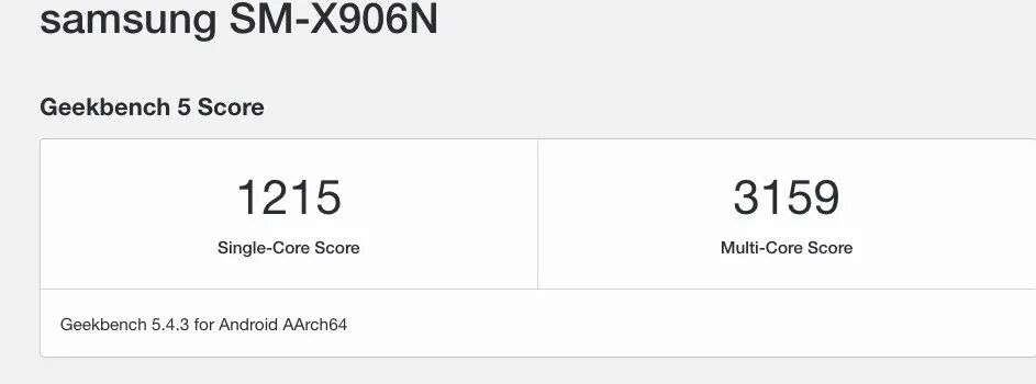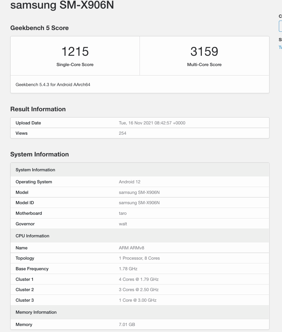 如上图所见,型号为samsung SM-X906N的三星新机(据说对应三星Galaxy Tab S8 Ultra旗舰平板)搭载型号为SM8450的高通骁龙处理器,也就是爆料的骁龙8 Gen1处理器,Geekbench 5单多核跑分分别为1215/3159。