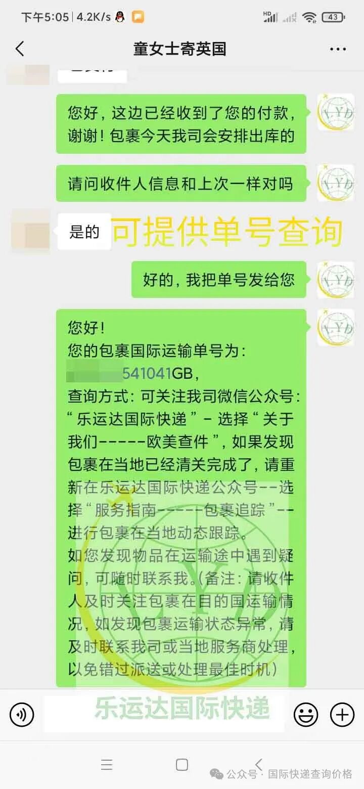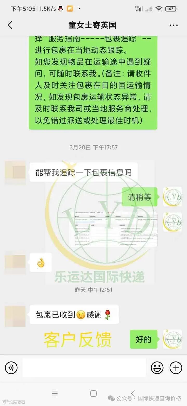 在全球化的今天,跨国邮寄已成为人们生活中的常见需求。天津市的童女士经常需要邮寄食品、药品以及生活用品给在英国留学的孩子,这次童女士需要邮寄一些食品以及调味料到英国去,但是询问过一些常见的国际快递如顺丰、DHL 等,都表示无法邮寄粉末类的调味料,为此童女士也是多方询问,最终在网上找到了乐运达国际快递,在了解邮寄要求以及注意事项后,决定进行邮寄,大概花了10天左右时间把包裹寄到了英国收件人手中。