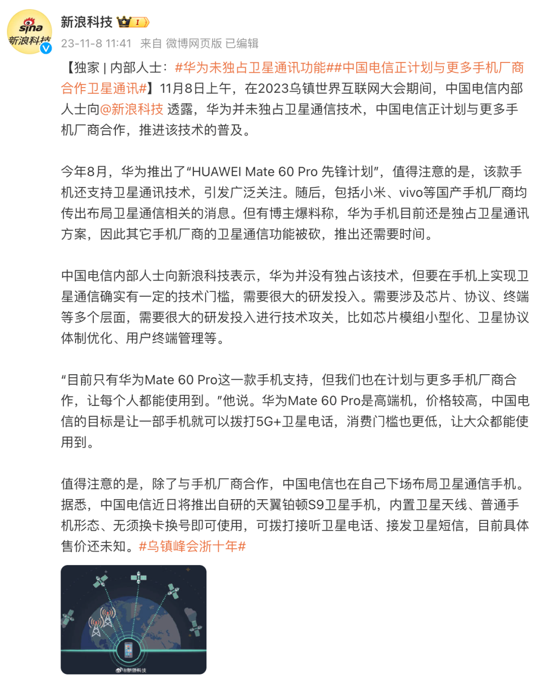 据新浪科技独家报道,中国电信内部人士透露,华为并未独占卫星通信技术,中国电信正计划与更多手机厂商合作,推进该技术的普及。