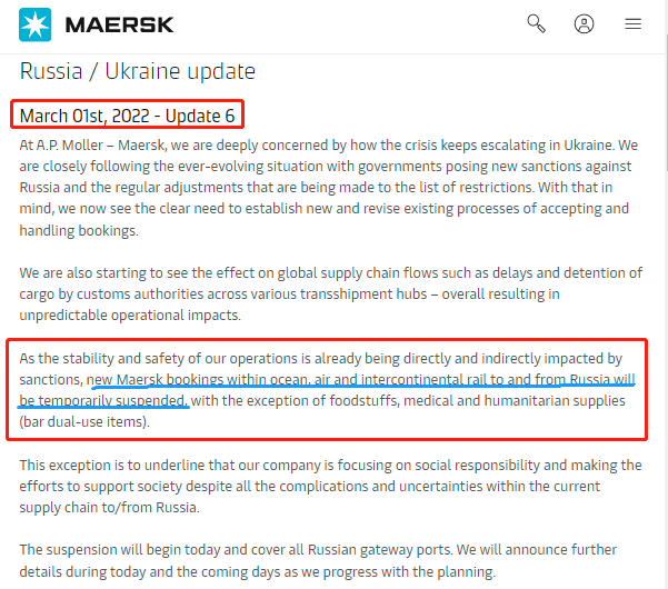 马士基、MSC宣布暂停所有俄罗斯业务预定