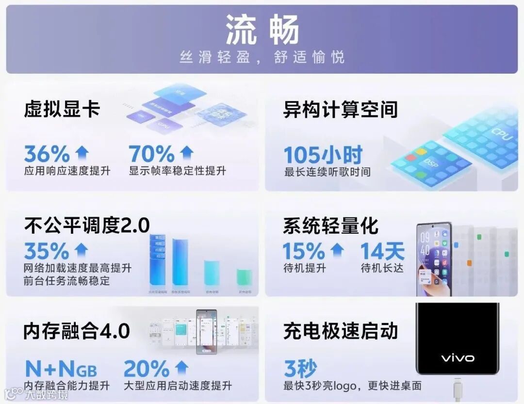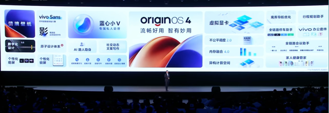 功能上,OriginOS 4有离库导航优化、全链路停车助手、vivo智能车载4.0、全链路会议助手、vivo办公套件、家人健康组件、超级省电、AI离线翻译功能;还有全新虚拟显卡、提供光追、插帧和超分的技术;异构计算空间,QQ音乐深度合作(提升音乐播放续航);