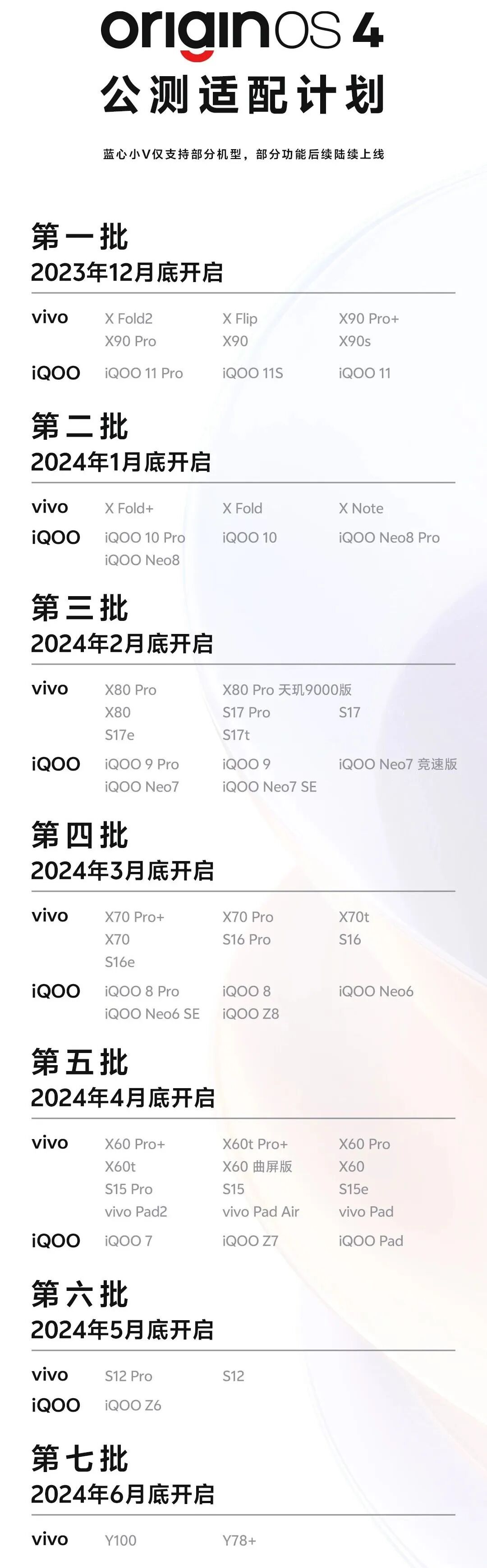 最终OriginOS 4适配计划见上图,除了iQOO 12系列、vivo X100系列将首发搭载外,其余机型将于明天开启内测,公测计划:第一批iQOO 11系列、vivo X90系列、XFold2、X Flip将于12月底开启,更多机型见上图即可。蓝心小V稍晚推出。大家可以看看自己的机型在第几批~