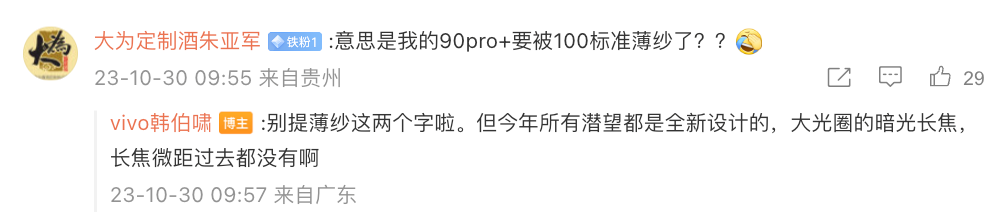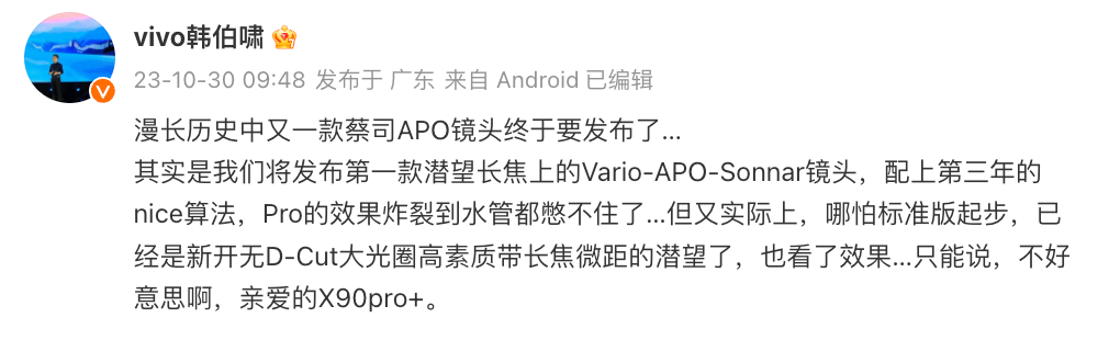 据预热,vivo X100系列全系潜望,X100 Pro将搭载行业首个蔡司APO长焦镜头,产品经理称“将发布第一款潜望长焦上的Vario-APO-Sonnar镜头,配上第三年的nice算法,Pro的效果炸裂到水管都憋不住了…但实际上,哪怕标准版起步,已经是新开无D-Cut大光圈高素质带长焦微距的潜望了,也看了效果…只能说,不好意思啊,亲爱的X90 Pro+。 ”就最后一句来看,新旗舰影像方面似乎还有薄纱vivo X90 Pro+的意思。