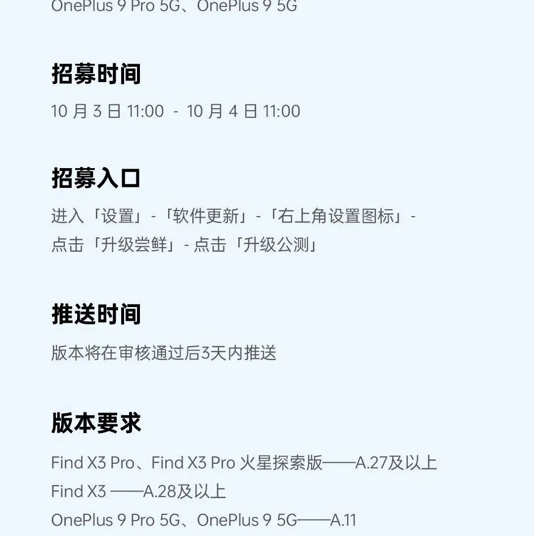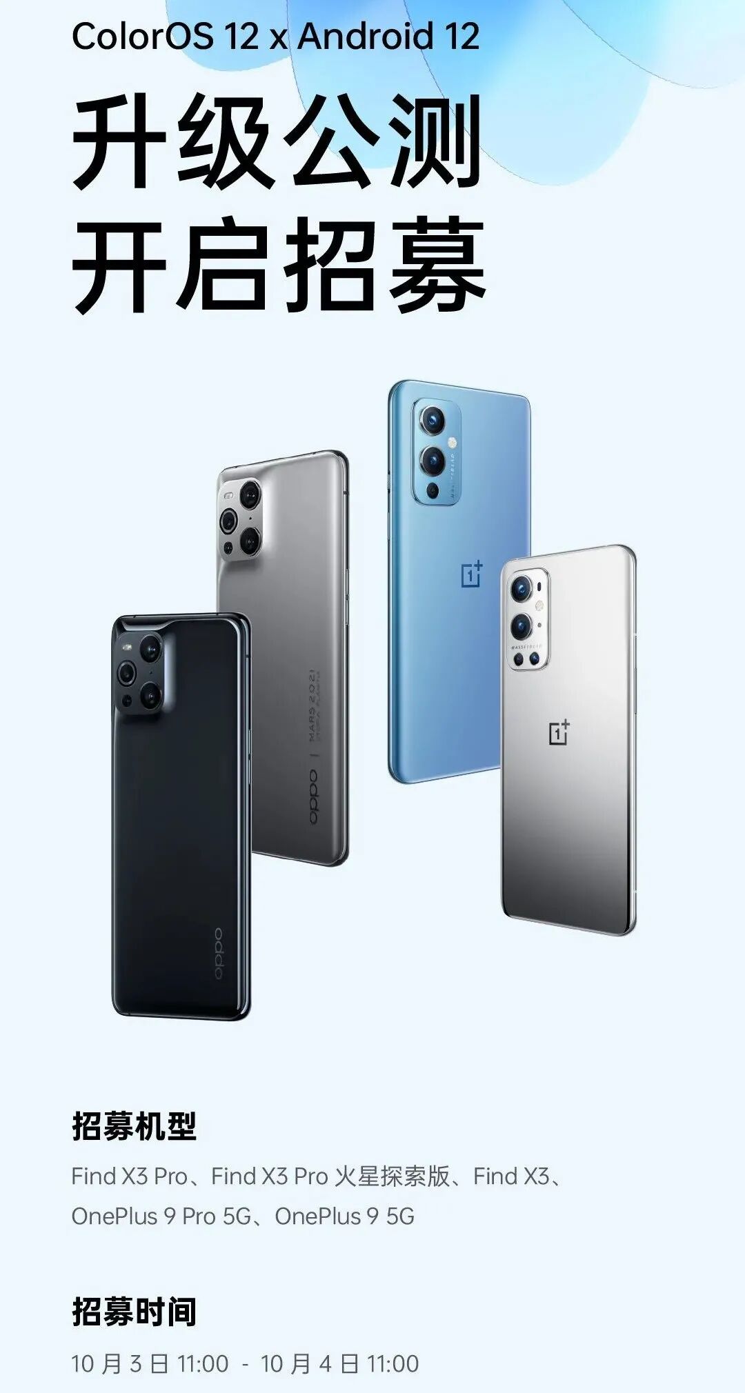 据了解,首批基于Android 12的ColorOS 12公测招募面向机型仅5款,分别是:OPPO Find X3 Pro、Find X3 Pro 火星探索版、Find X3、一加9 Pro 5G、一加 9 5G,招募时间截止10月4日也就是明天11点。