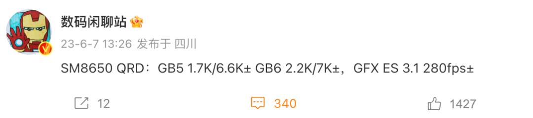 性能表现上,网传骁龙8 Gen3的安兔兔跑分能达到160W±,工程机Geekbench 5单多核1700±/6600±,Geekbench 6单多核2200±/7000±,GFX Bench 1080P曼哈顿3.1 OpenGL成绩为280fps±,对比骁龙8 Gen2的133W±/220fps±、天玑9200的126W±/226fps来说,性能提升不少。