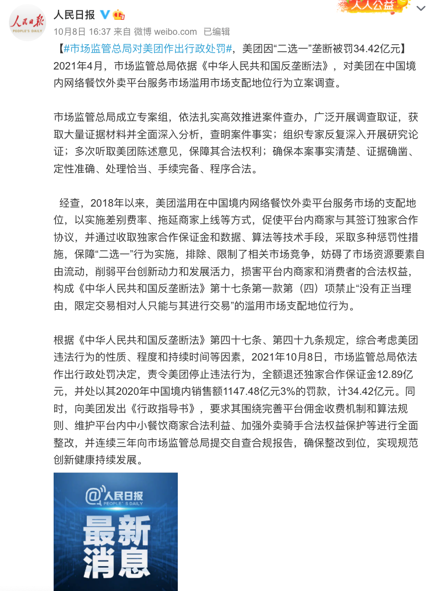 早前一直有网友爆料美团要求商家“二选一”,什么叫“二选一”?举个例子,一家餐饮店想上线外卖服务,美团要求其只能在美团平台或饿了么平台选一个上线。2021年4月,市场监管总局依据《中华人民共和国反垄断法》,对美团在中国境内网络餐饮外卖平台服务市场滥用市场支配地位行为立案调查。