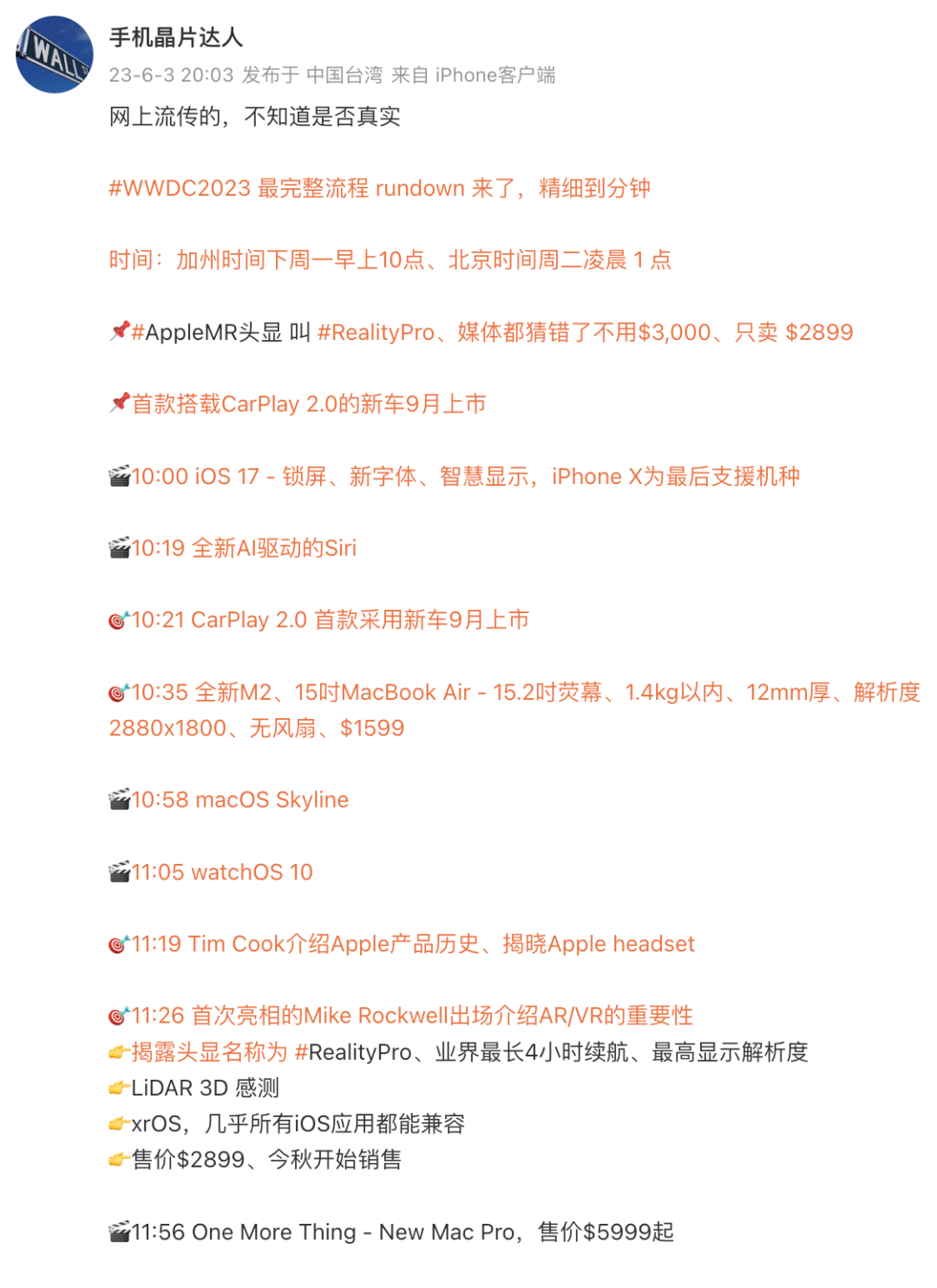 网传的WWDC2023流程显示,硬件方面,发布会上将带来苹果首款头显设备命名为RealityPro、全新M2芯片的15英寸MacBook Air,以及新款Mac Pro。