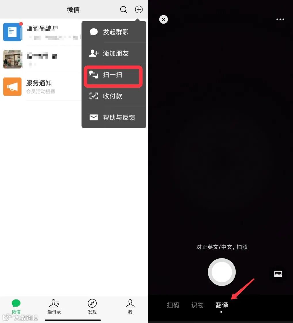打开微信点击右上角的【+】,点击【扫一扫】。然后切换到翻译模式,对着需要翻译的文字进行拍照就可以翻译了。