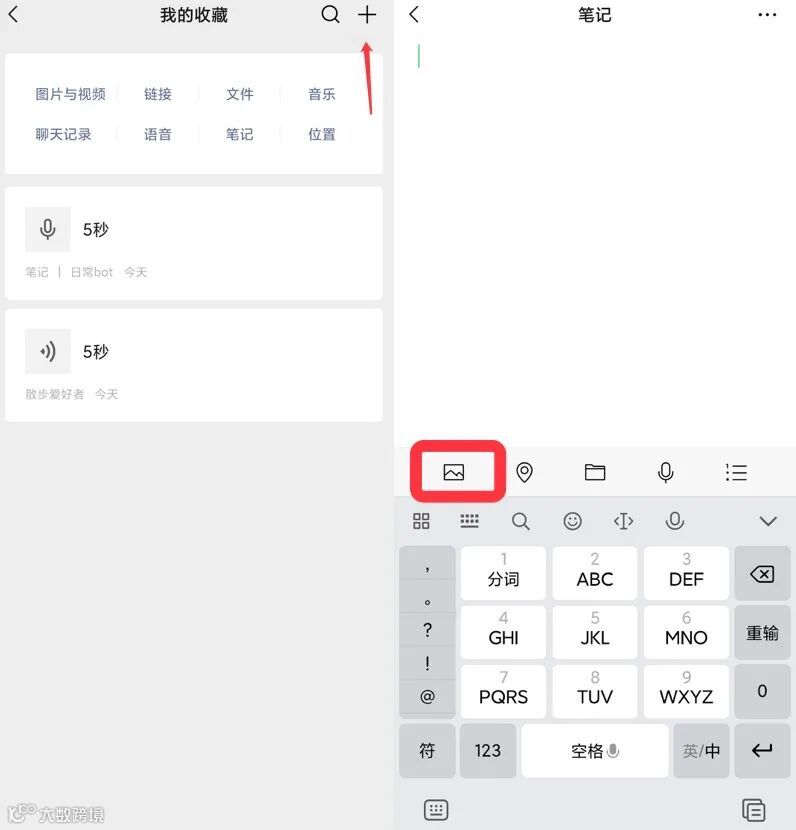 打开微信的收藏功能,接着点击右上角【+】新建收藏,点击键盘上方的相册按钮上传手机中的图片。