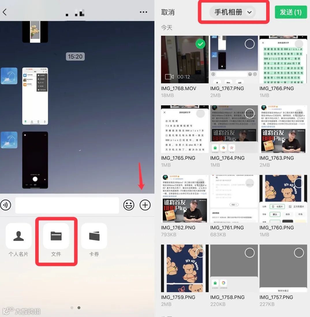 打开微信聊天窗口,点击【+】后点击【文件】,在文件上传界面选择【手机相册】,这时候就可以选择大文件视频/图片发送了,而且比直接发送要清晰。