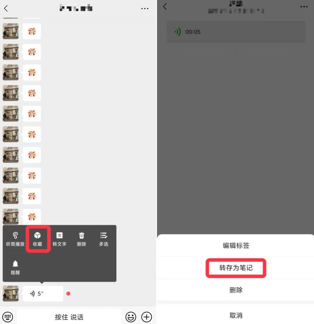 首先,将你需要转发的语音收藏,接着在微信收藏中找到收藏的语音,然后点击右上方的【...】之后,点击【转存为笔记】。