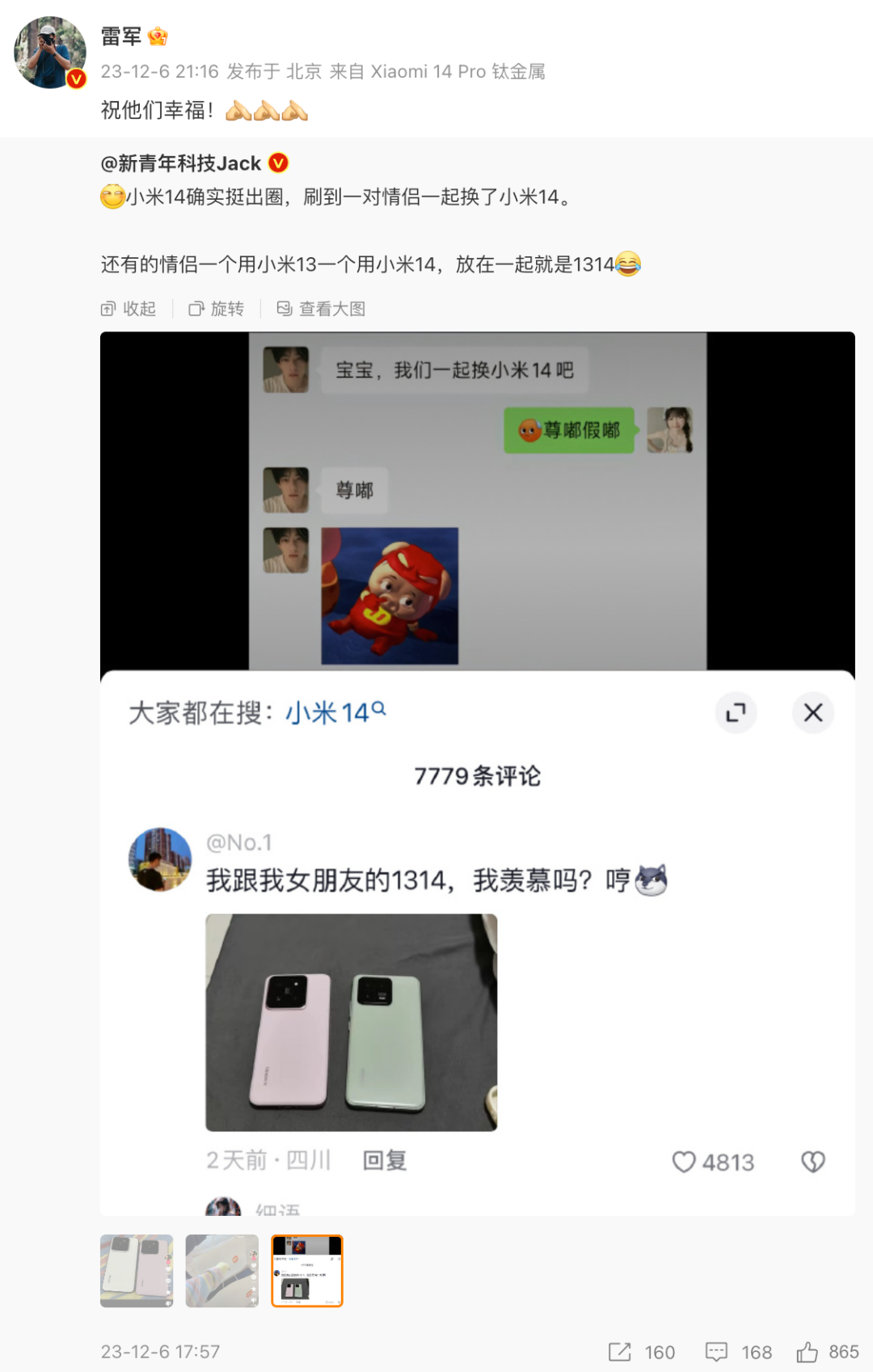 近日抖音有网友在换机小米14的视频下称和女朋友拥有1314,因为谐音“一生一世”获得不少点赞。有博主分享了相关视频截图获得了小米雷军的转发。
