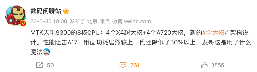 爆料达人数码闲聊站另外还透露称,X4超大核频率相对温和,天玑9300性能或狙击A17,纸面功耗居然较上一代还降低了50%以上,预计最快10月份能看到实测。或许可以期待下实际表现。