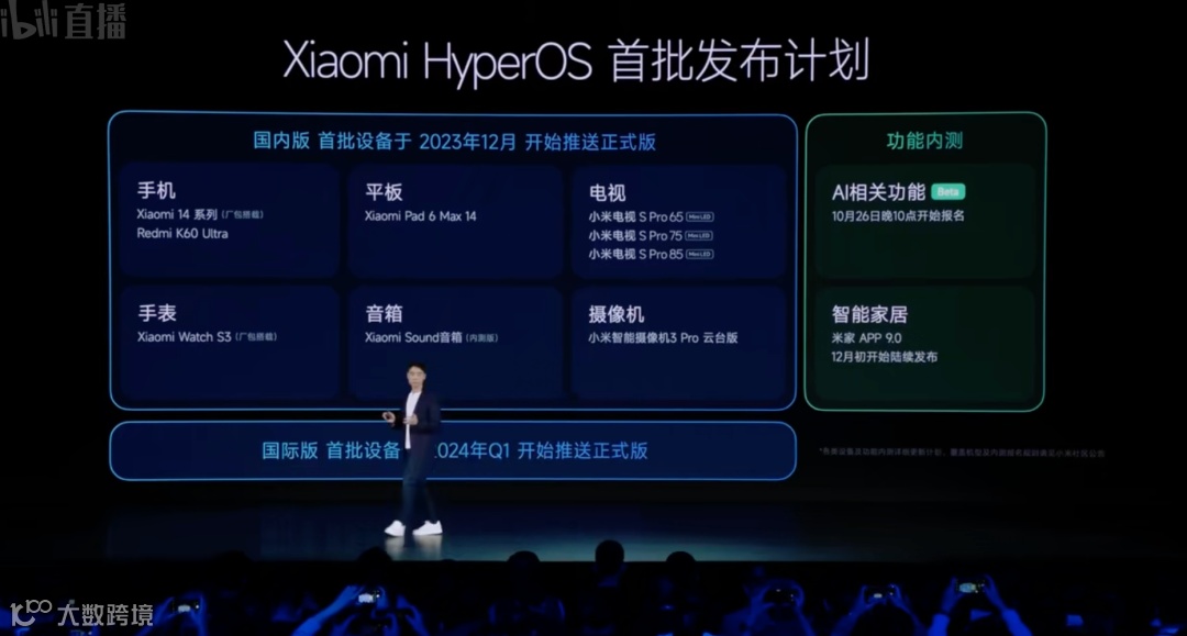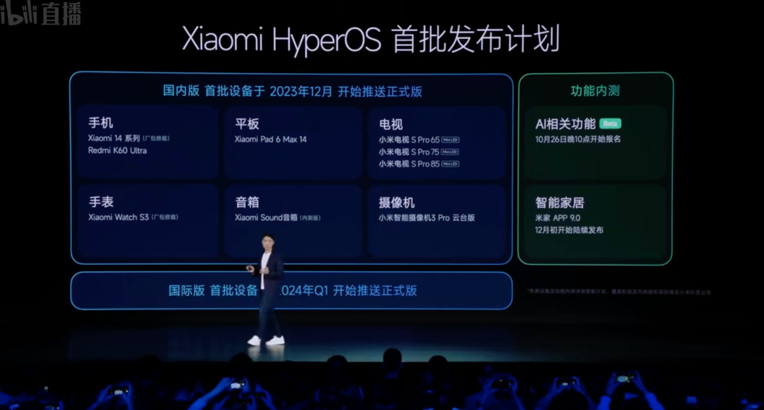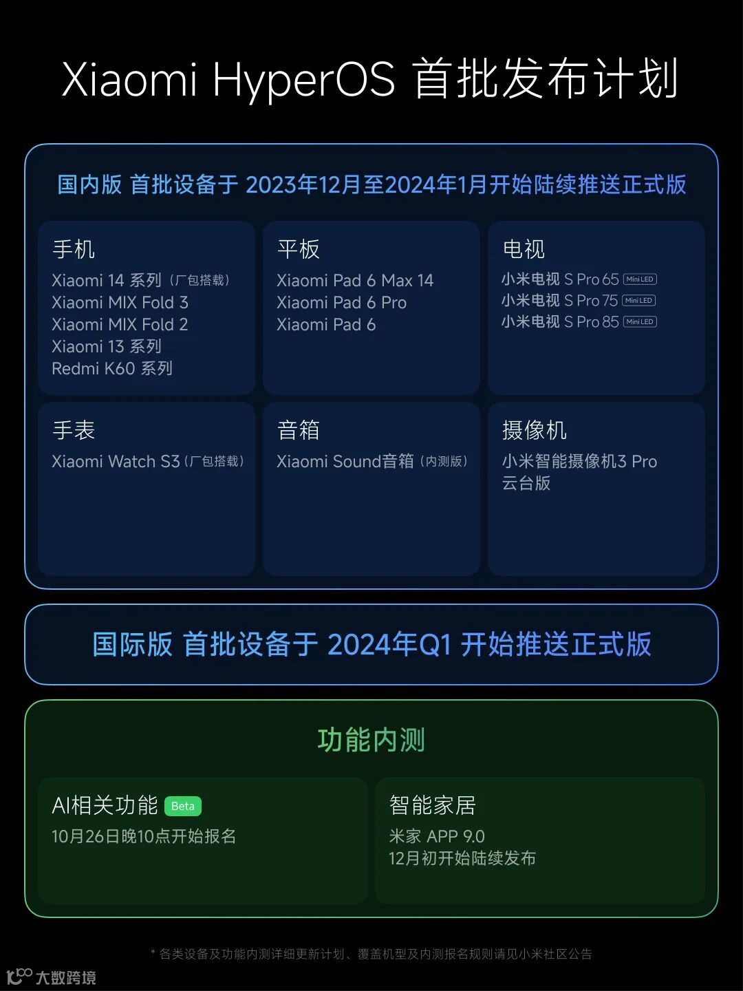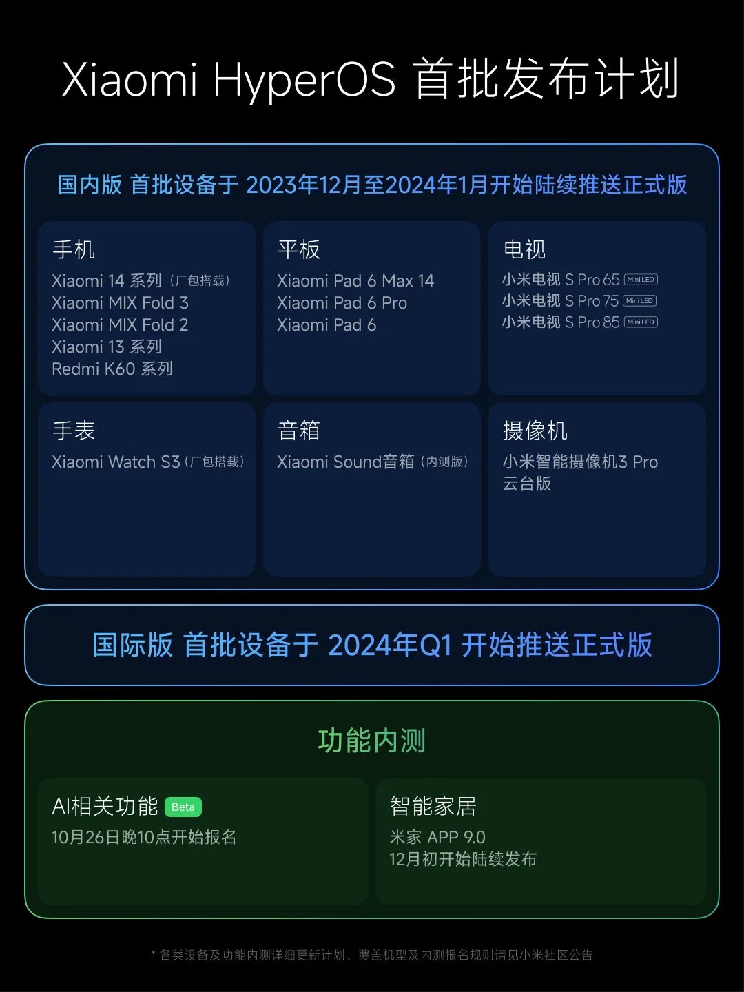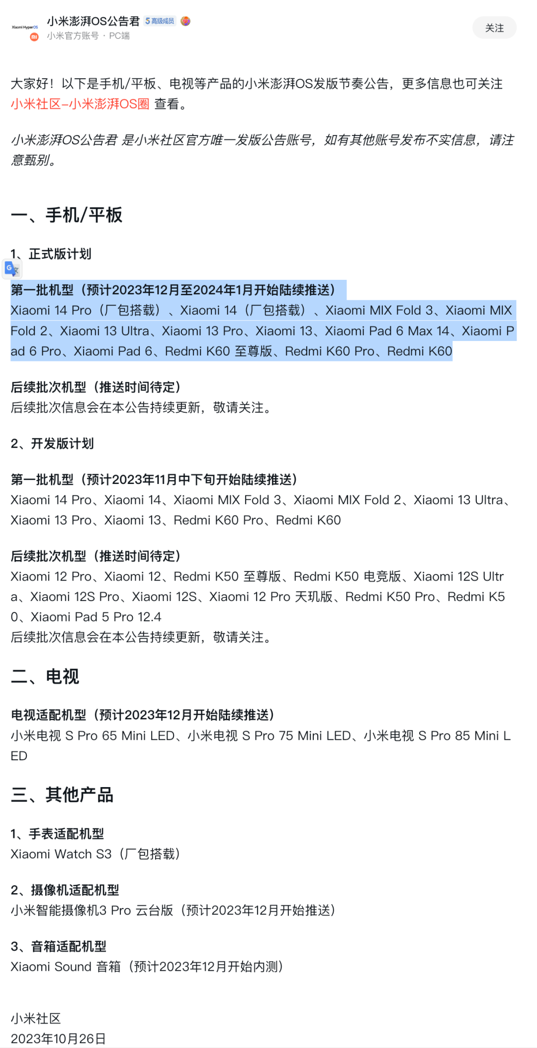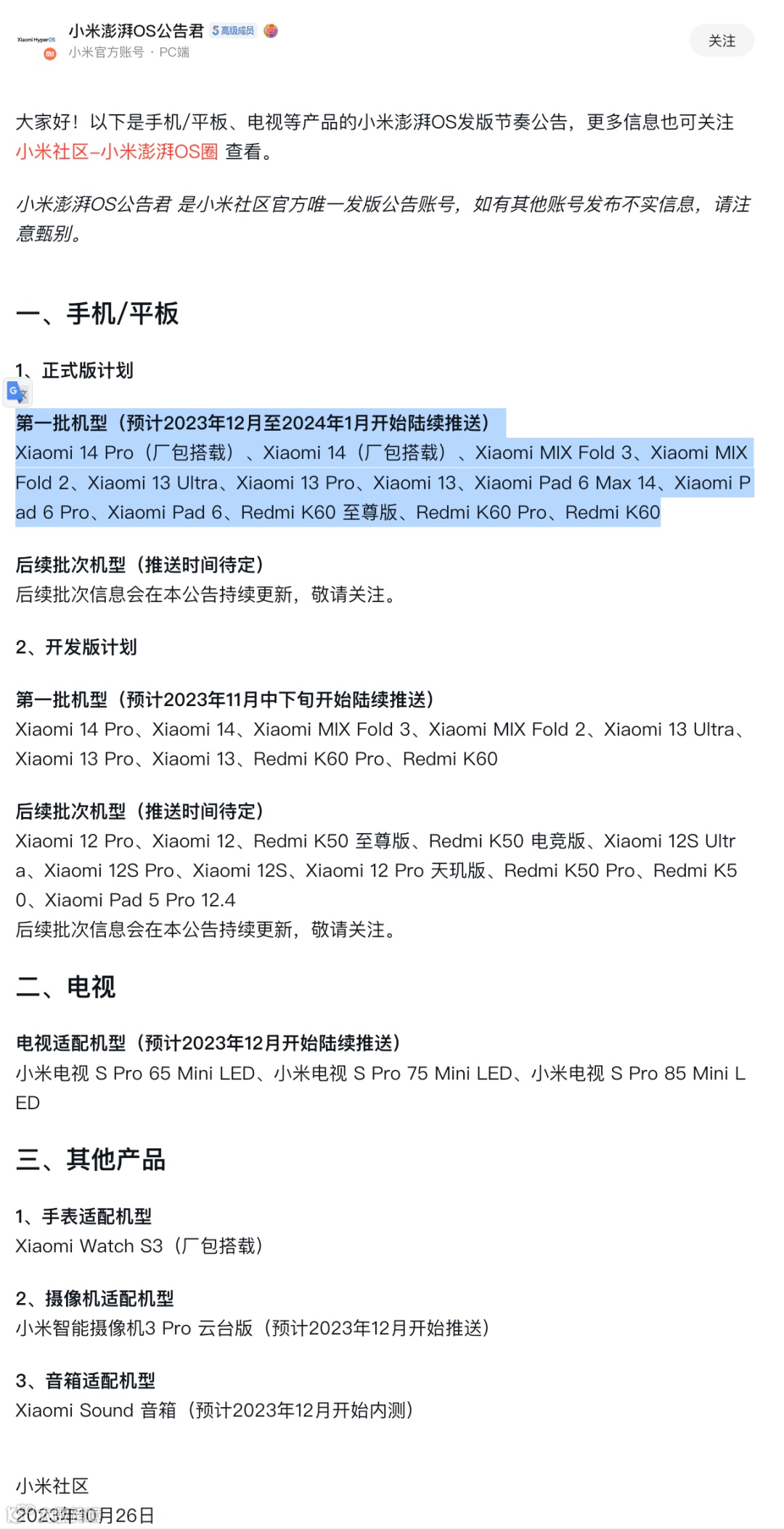 发布会结束后官方更新的计划表显示,小米澎湃OS正式版首批有小米14系列(出厂搭载)、小米MIX Fold 3、MIX Fold 2、小米13 Ultra、小米13/13 Pro、Redmi K60至尊版、Redmi K60/K60 Pro等,预计2023年12月-2024年1月陆续推送。