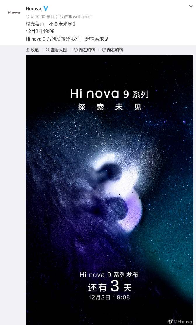 官方微博还预热Hi nova9系列发布后将于12月2日19:08举行,参照之前经验,猜测这次要发布的Hi nova9系列或许配置外观等和之前华为发布的nova 9系列基本一样,但支持5G同时机身logo变成中邮的Hi nova?🤔 具体情况蹲一个发布吧。