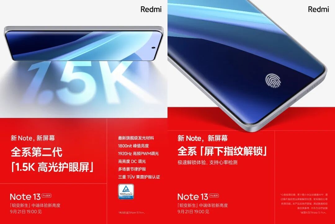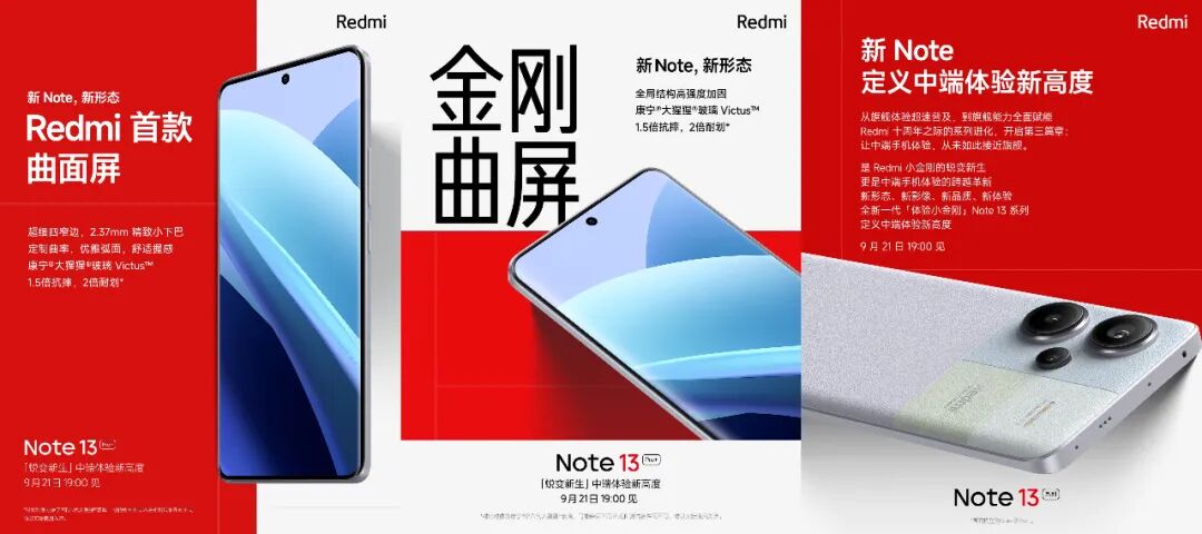 Redmi Note 13系列新品发布会官宣将于9月21日19点举行,届时将带来Note 13 Pro+、Note 13 Pro、Note 13三款手机,预热海报中左侧这台是Note 13 Pro+:居中单挖孔曲面屏、后盖是多色素皮拼接设计;右侧这台则是Note 13 Pro,居中单挖孔直屏、直角中框、玻璃机身。