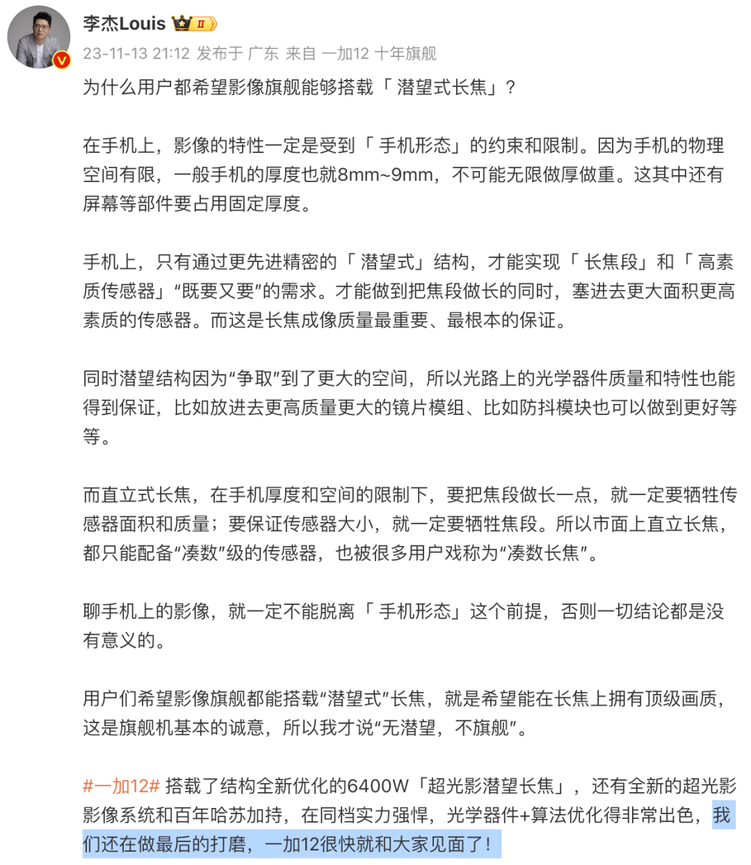 李杰还表示「在做最后的打磨,一加12很快就会和大家见面」,现在就等发布日期官宣了。