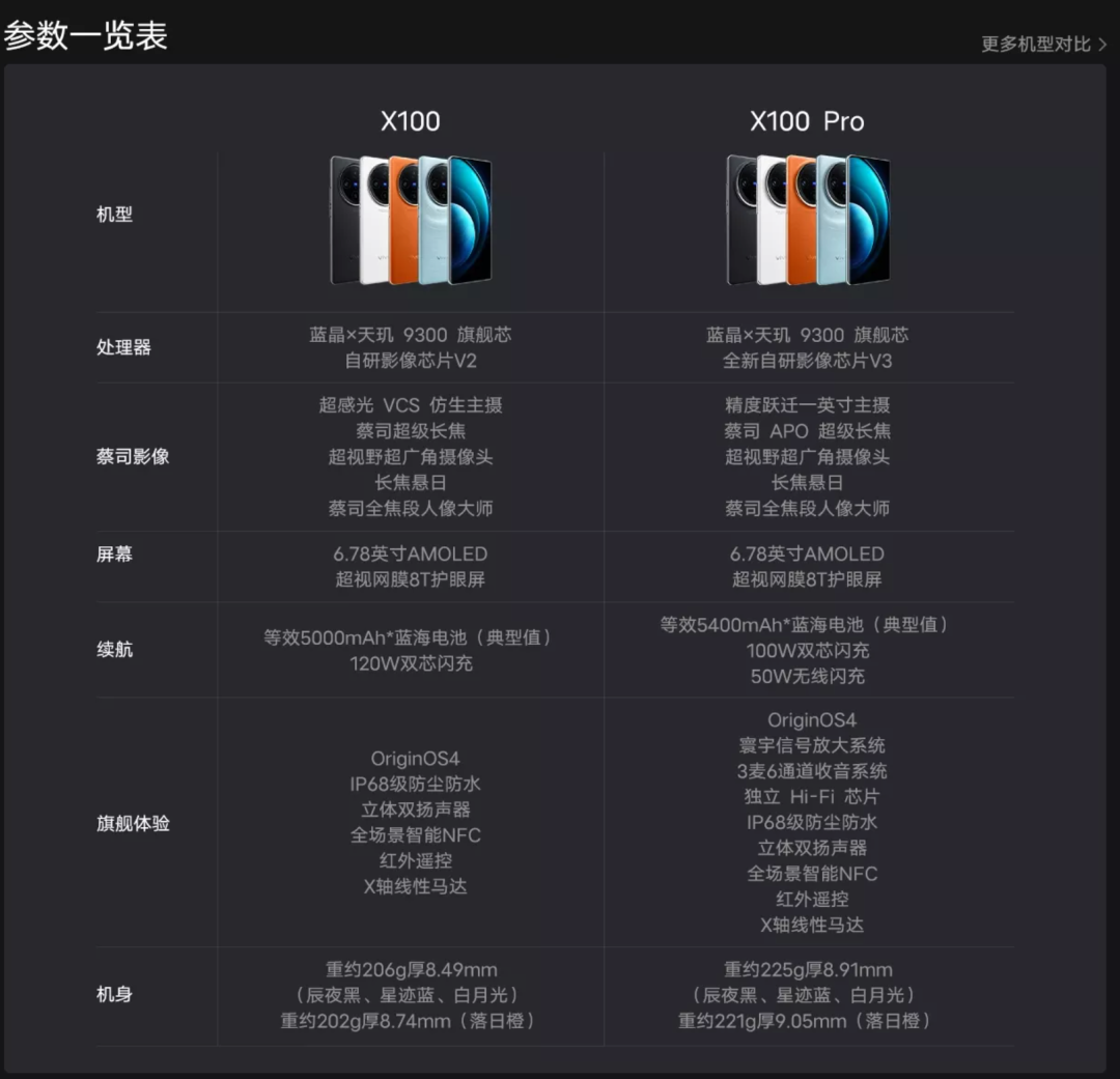 而vivo X100 Pro配备5400mAh电池,100W有线快充、50W无线闪充,另外有独立HiFi芯片、寰宇信号放大系统,抬杠级导航系统,3麦6通道收音系统等。此外,X100 Pro还首发V3自研影像芯片(6nm工艺),后置为①5000万像素 IMX989超感光一英寸主摄 新一代蔡司T*镀膜 ②5000万像素超广角 支持4K60视频录制 ③5000万像素蔡司APO潜望长焦 有OIS 蔡司浮动镜头设计 1/2英寸 支持18cm长焦微距和最高100X数码变焦,支持4K电影人像视频(4K视频虚化美颜、电影风格预设、电影效果调节和自定义、安卓首发4K电影人像拍后调整功能等)。