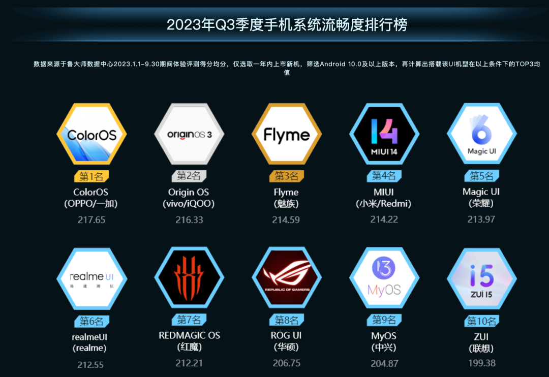 至于2023Q3的手机系统UI流畅排行榜,TOP 3依次是:①ColorOS(OPPO和一加);②OriginOS(vivo和iQOO);③Flyme(魅族)(数据来源鲁大师数据中心2023.7.1-9.30期间体验评测机型得分均分,仅选取一年内上市新机,筛选Android 10及以上版本,再计算中搭载该UI机型在以上条件下的TOP3均值)。你现在用的哪家系统UI?认可这份榜单吗?
