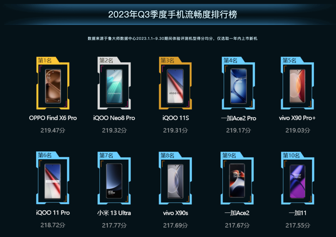 其中鲁大师发布的Q3季度手机流畅榜TOP 5依次是:①OPPO Find X6 Pro;②iQOO Neo8 Pro;③iQOO 11S;④一加Ace2 Pro;⑤vivo X90 Pro+。(数据来源鲁大师数据中心2023.7.1-9.30期间体验评测机型得分均分,仅选取一年内上市新机)