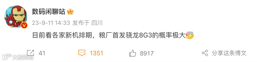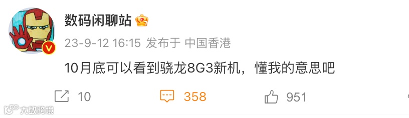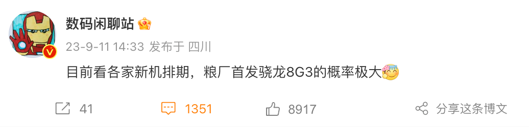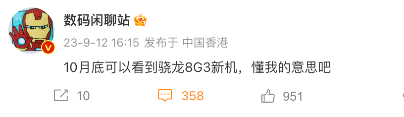 据数码闲聊站爆料,小米首发骁龙8 Gen3的概率极大,双十一预计能首销。并称首款骁龙8 Gen3新机预计10月底能和大家见面。综合来看,应该算是暗示小米14系列有望10月底首发8Gen3,就等后续官方消息了。