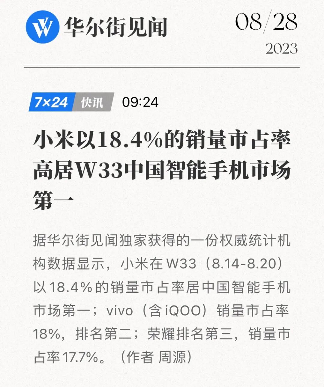 华尔街见闻报道称,一份权威统计机构数据显示,小米在第33周(8.14-8.20期间)以18.4%的市场份额位居国内智能手机第一,vivo则排名第二(18%),荣耀第三(17.7%)。