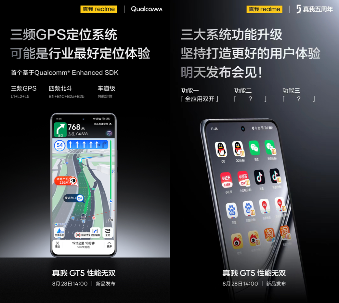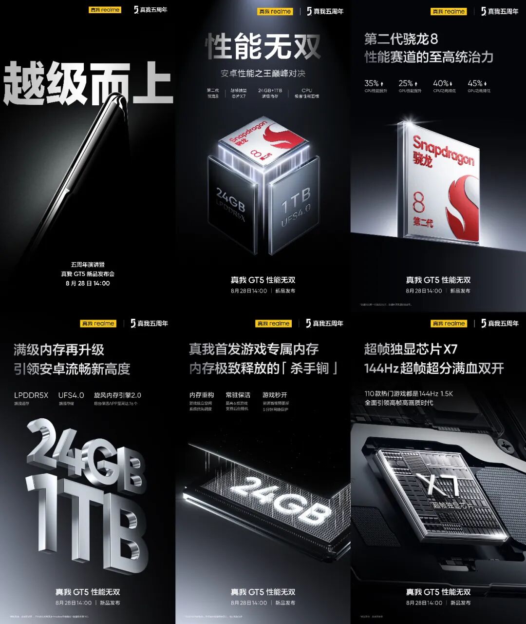 最后是realme的消息。姗姗来迟的真我GT5将于8月28日也就是明天14点发布,今天官方预热了软件部分,索性把所有配置给大家汇总前瞻下。