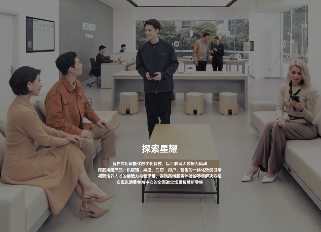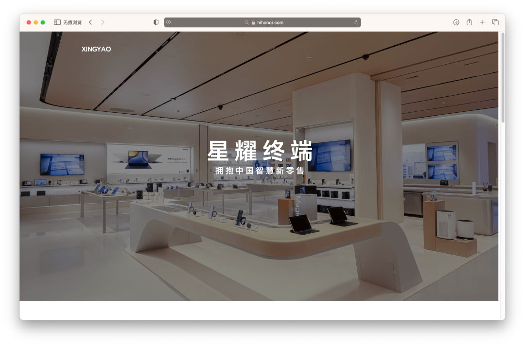 星耀官网网址为https://www.hihonor.com/cn/xingyao/ ,打开首页就是「星耀终端,拥抱中国智慧新零售」的字样。