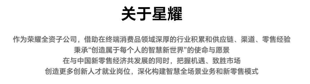 官方介绍称星耀是荣耀全资子公司,旨在应用智能化数字化科技,以互联网大数据为驱动,深度构建产品、供应链、渠道、门店、用户、营销的一体化效能引擎,凝聚培养人才的创造力与新思维,实践高端服务体验的零售解决方案,实现以消费者为中心的全渠道全场景智慧新零售。换言之主要涉及终端产品的供应链、渠道、零售等环节,并不是做手机的。你看好荣耀后续发展吗?