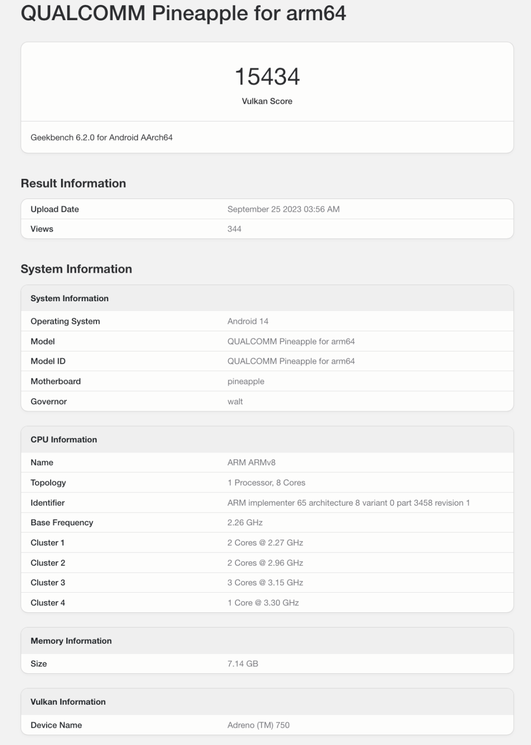 今天在Geekbench 6后台发现的GPU成绩就来自骁龙8 Gen3超频版工程机,跑分达到15434。