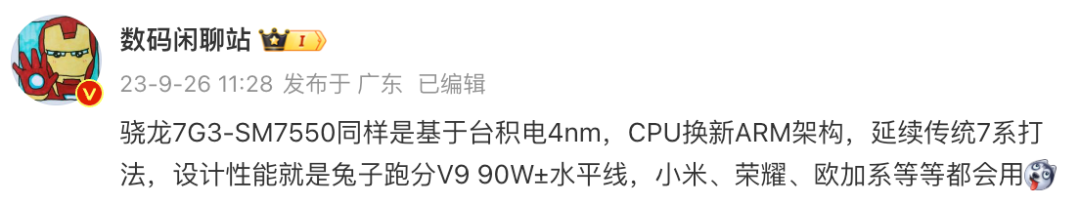 据数码闲聊站表示,型号为SM7550的骁龙7 Gen3同样基于台积电4nm工艺,CPU将换新ARM架构,延续传统7系打法,设计性能表现上,安兔兔V9版本综合跑分是90W±水平线,小米、荣耀、欧加系等等新机都会用。