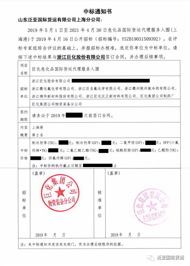 2019年4月,在巨化集团组织的2019至2021年度化工品物流项目竞标中,泛亚上海分公司经过层层筛选、激烈角逐,最终以总分第二名的好成绩,成功中标。