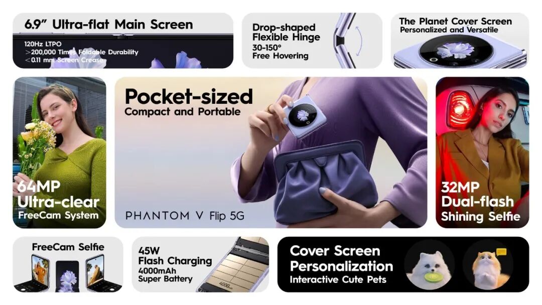 外观ID部分,传音Phantom V Flip展开是一块6.9英寸FHD+ OLED居中单挖孔屏,120Hz LTPO刷新率,提供黑色和紫色2个配色,后置相机模组为圆形Deco,模组内嵌一块圆形副屏,具体为后置双摄64MP主摄+13MP超广角,前置32MP,官方称其铰链采用航空级钢材料,支持30°-150°悬停,折痕≤0.11 mm,关闭无缝隙。