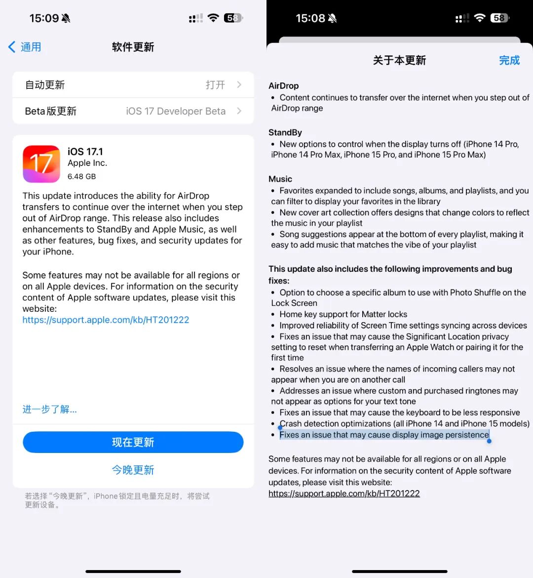 如上图所见,iOS 17.1 RC版更新介绍里称修复了可能导致显示图像持久性的问题。