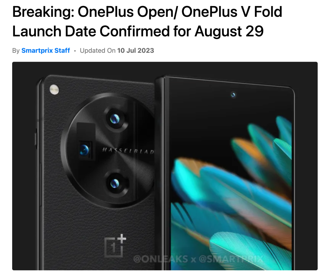 据smartprix报道,其从品牌内部可信消息源了解到一加首款折叠屏将在8月最后一周在纽约发布,预计8月29日正式发布。具体产品名方面,目前有OnePlus Open和OnePlus V Fold两个版本,最终命名需以官方为准。